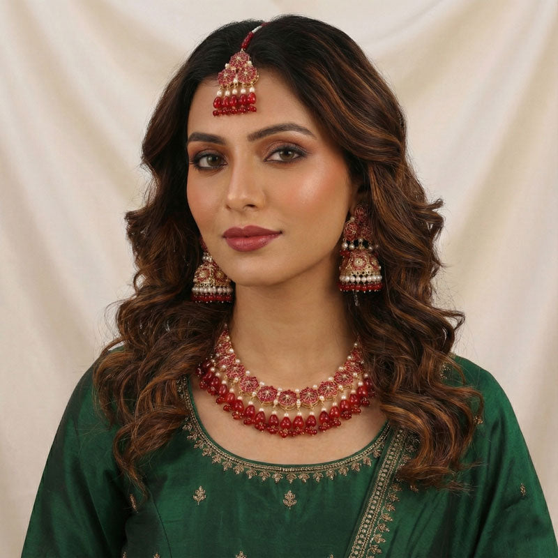 The Afsana Heritage Necklace Set is a luxurious traditional ensemble featuring a finely detailed necklace, matching statement earrings, and a coordinated maang tikka. Crafted with intricate floral motifs, stone embellishments, and graceful bead drops, this set reflects timeless bridal elegance with a regal finish. Perfect for weddings, barat, and formal celebrations, it is available in multiple color variations to complement a wide range of bridal outfits.