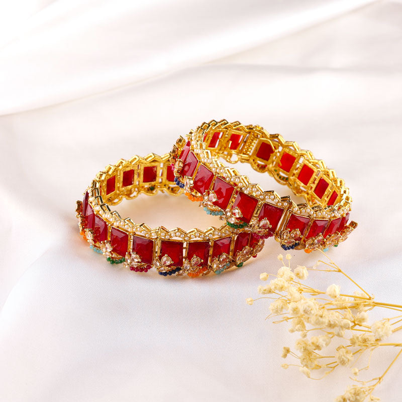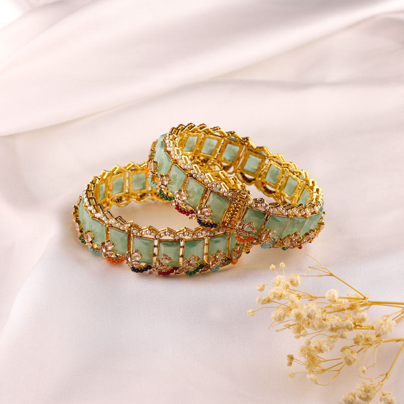 Command attention with Facet’s Radiance gold bangles, featuring striking rectangular stones framed with multicolor crystal accents. The rich gold finish enhances their regal charm, making them perfect for bridal wear, festive occasions, and elegant evening ensembles. A true statement of luxury, tradition, and timeless beauty.
