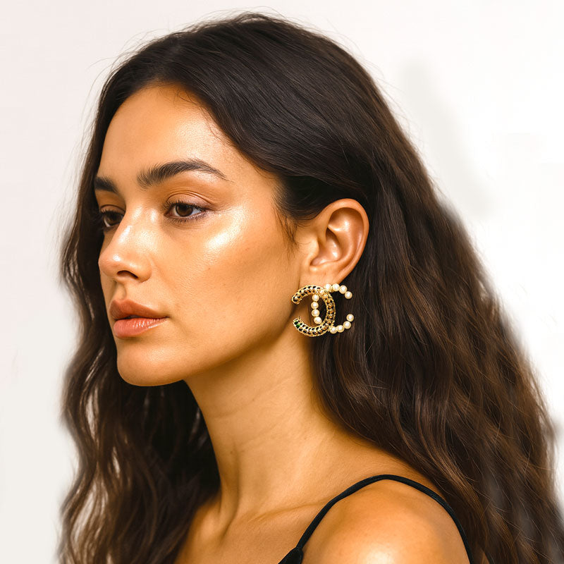 Elegant and bold, our Pearl & Black Crystal Monogram Stud Earrings feature a signature double-C design adorned with glossy white pearls and shimmering black crystals. These gold-tone statement studs offer a luxe blend of contrast and sparkle—perfect for elevating any chic ensemble.