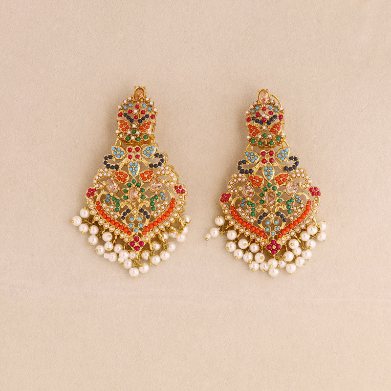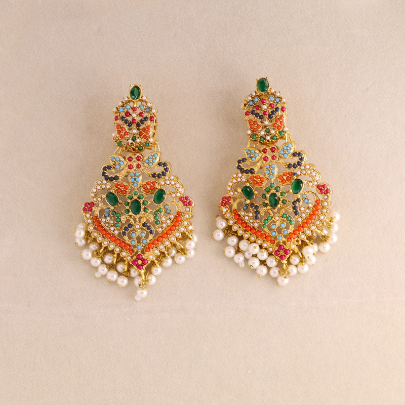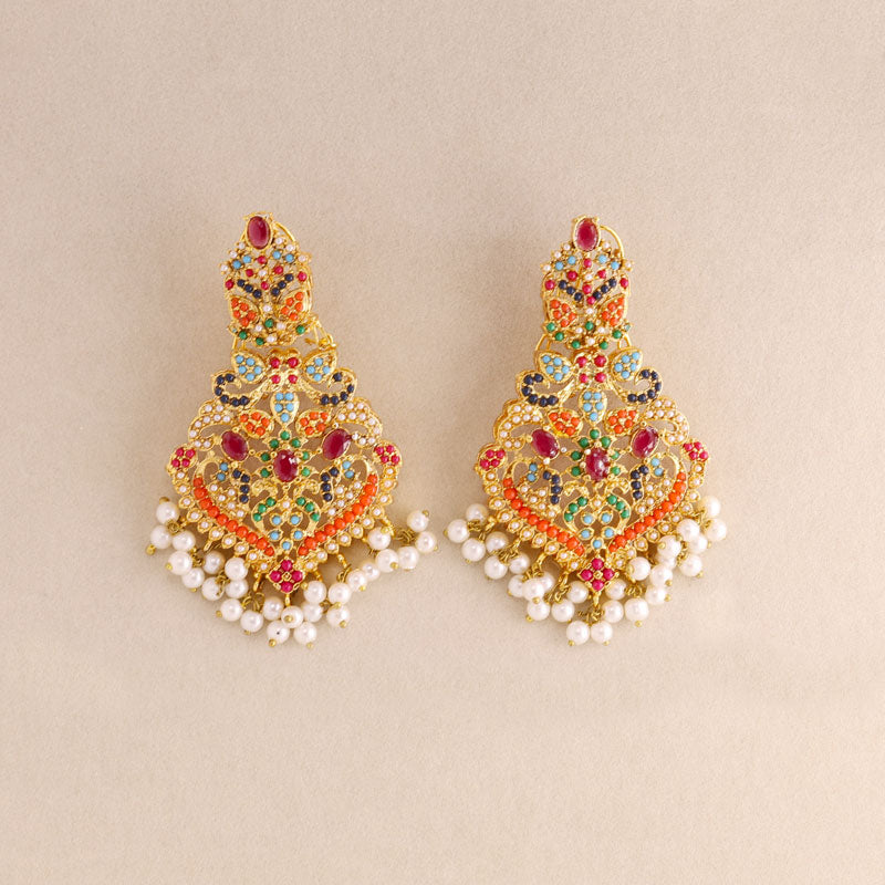 Add royal elegance to your look with this handcrafted multicolor Kundan necklace set featuring vibrant green stones, red and blue accents, and delicate pearl drops. Perfect for weddings, festive occasions, and traditional celebrations, this gold-plated jewelry set includes a statement necklace and matching earrings for a timeless ethnic charm.